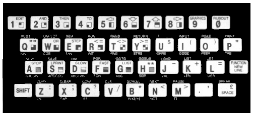 The ![]() What you want to do of course is rub out the first +, and replace it by - let us say - 3. First you have to move the cursor so that it is just to the right of the first +; there are two keys, ![]() ![]() ![]() PRINT + ![]() Now press the RUBOUT key (shifted 0), and you will get ![]() RUBOUT rubs out the character (or keyword) immediately to the left of the cursor. If you now press 3 this will insert a '3', again immediately to the left of the cursor, giving PRINT 3 ![]() and pressing NEWLINE gives the answer (5). The ![]() ![]() Summary This chapter has covered how to type messages in for the ZX81, explaining the single keystroke system for words, the ![]() ![]() ![]() ![]() ![]() The keyboard Here is a picture of the keyboard. |