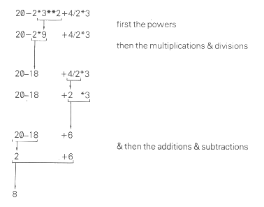 We formalize this by giving each operation a priority, a number between 1 & 16. The operations with highest priority are evaluated first, & operations with equal priority are evaluated in order from left to right. ** has priority 10 * and / have priority 8 + & - have priority 6 When - is used to negate something, as when you write -1, then it has priority 9. (This is unary minus, as opposed to the binary minus in 3-1: a unary operation has one operand, while a binary operation has two. Note that on the ZX81 you cannot use + as a unary operation.) This order is absolutely rigid, but you can circumvent it by using brackets: anything in brackets is evaluated first & then treated as a single number, so that PRINT 3*2+2 gives the answer 6+2 = 6, but PRINT 3*(2+2) gives the answer 3*4 = 12. A combination like this is called an expression - in this case, an arithmetic or numeric expression because the answer is a number. In general, whenever the computer is expecting a number from you, you can give it an expression instead and it will work out the answer. You can write numbers with decimal points (use the full stop), & you can also use scientific notation - as is quite common on pocket calculators. In this, after an ordinary number (with or without a decimal point), you can write an exponent part consisting of the letter E, then maybe + or -, & then a number without a decimal point. The E here means '*10**' ('times ten to the power of'), so that 2.34E0 = 2.34 * 10**0 = 2.34 2.34E3 = 2.34 * 10**3 = 2340 2.34E-2 = 2.34 * 10**-2 = 0.0234 & so on. (Try printing these out on the ZX81.) The easiest way of thinking of this is to imagine the exponent part shifting the decimal point along to the right (for a positive exponent) or to the left (for a negative exponent). You can also print more than one thing at once, separating them either with commas (,) or semicolons (; or shifted X). If you use a comma, then the next number will be displayed starting either at the left hand margin, or in the middle of the line in the 16th column. If you use a semicolon, then the next number will be displayed immediately following the last one. Try PRINT 1;2;3;4;5;6;7;8;9;10 & PRINT 1,2,3,4,5,6,7,8,9,10 to see the differences. You can mix commas & semicolons within a single PRINT statement if you want. Summary Statements: PRINT, with commas & semicolons Operations: +,-,*,/,** Expressions, scientific notation |